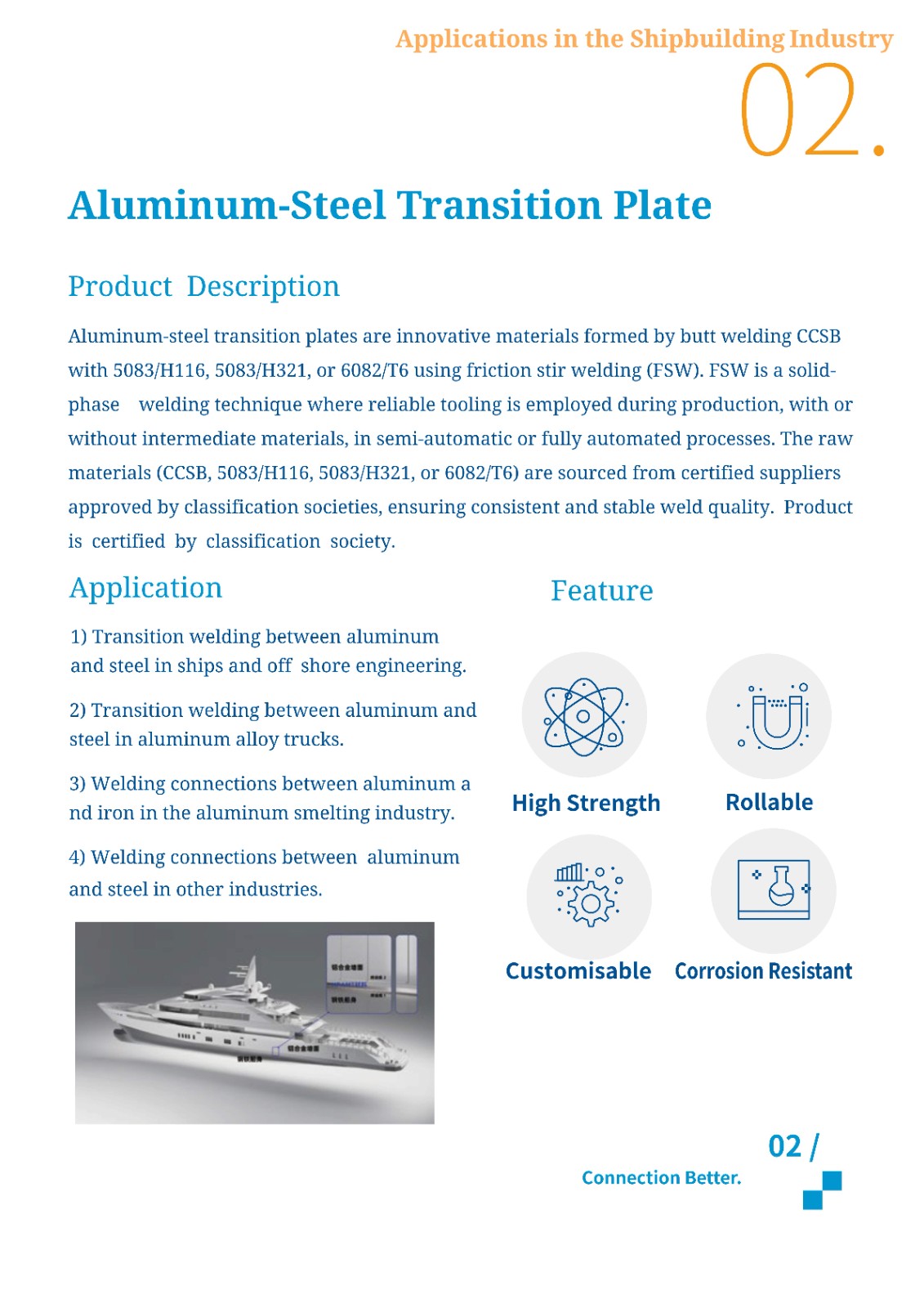 Aluminum-steel transition plates are innovative materials formed by butt welding CCSB with 5083/H116,5083/H321,0r 6082/T6 using friction stir welding (FSW).